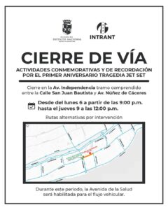 La Alcaldía del Distrito Nacional y el Instituto Nacional de Tránsito y Transporte Terrestre (INTRANT) informaron sobre el cierre temporal de un tramo de la Avenida Independencia debido a la realización de actividades conmemorativas por el primer aniversario de la tragedia de Jet Set.